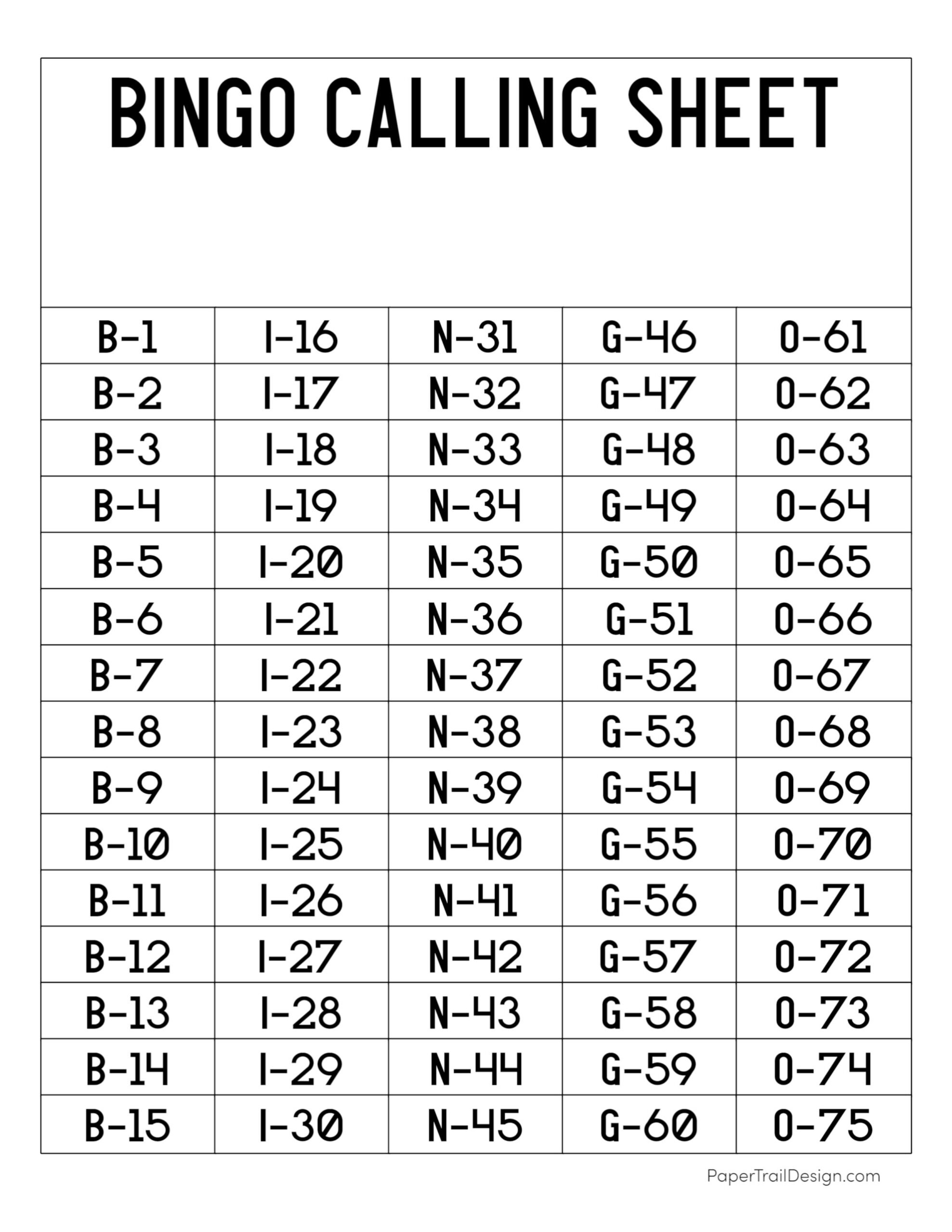 Bingo Calling Sheet PrintableBingo Calling Sheet Printable