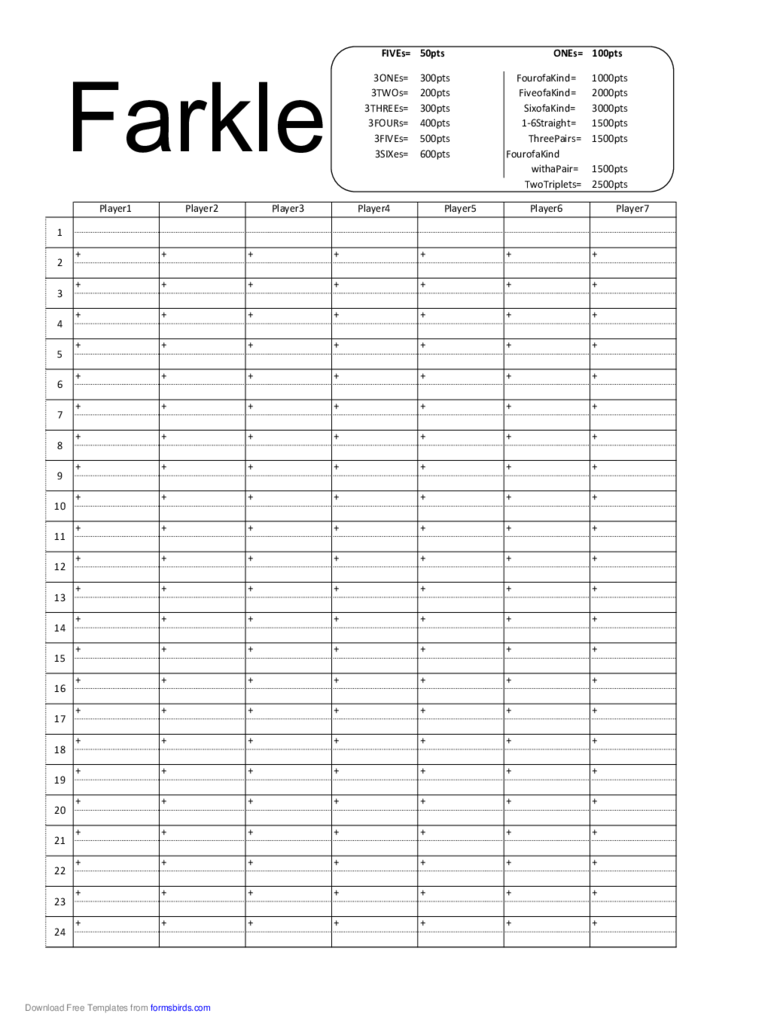 Farkle is a popular dice game that can be played with friends and family. Keeping track of scores can sometimes be a challenge, which is why having a printable Farkle score sheet can be very helpful. These score sheets are designed to make it easy to keep track of points and determine a winner at the end of the game.